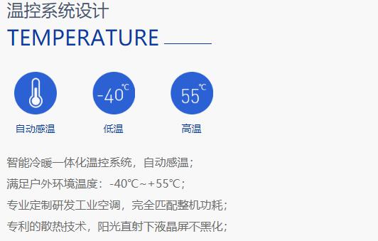户外情况纷繁复杂,温度变化、湿度变化幅度都比较大,这就使得户外广告机要直面昼夜温差和天气变化所带来的潮湿、风沙、暴晒等恶劣环境。由于设备内部是由精密电子元器件构成,一旦温度过高或者过低都会对这些器件造成致命损坏,因此风扇和空调散热系统就显得尤为重要。创伟达温控系统采用专利设计的智能冷暖一体化温控系统,可以实现自动感温,能够在户外-40℃~+55℃的环境下正常使用。强大、科学、合理的散热技术,也可以保证液晶屏在阳光的直射下不黑屏、不花屏,时刻保护机体在任何温度情况下的可靠、稳定运行。